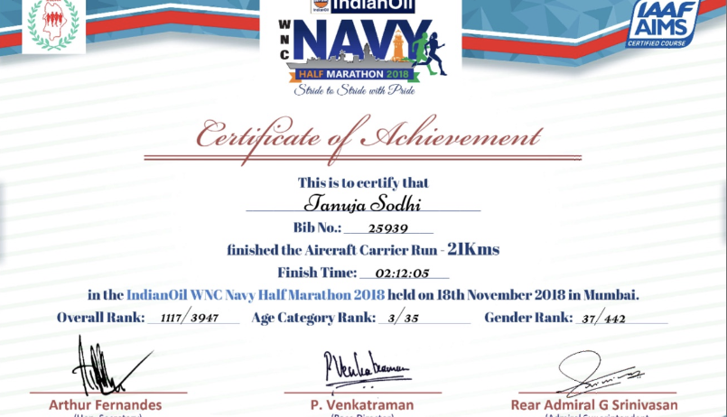 I proudly participated in the WNC Navy Marathon organised by the Western Naval Command, and secured the 3rd position in my age category. It was a proud moment and a deeply momentous experience for me as a former Naval officer, to join an event organized by the Navy. The marathon was open to both Navy personnel and civilians, creating a beautiful sense of camaraderie.