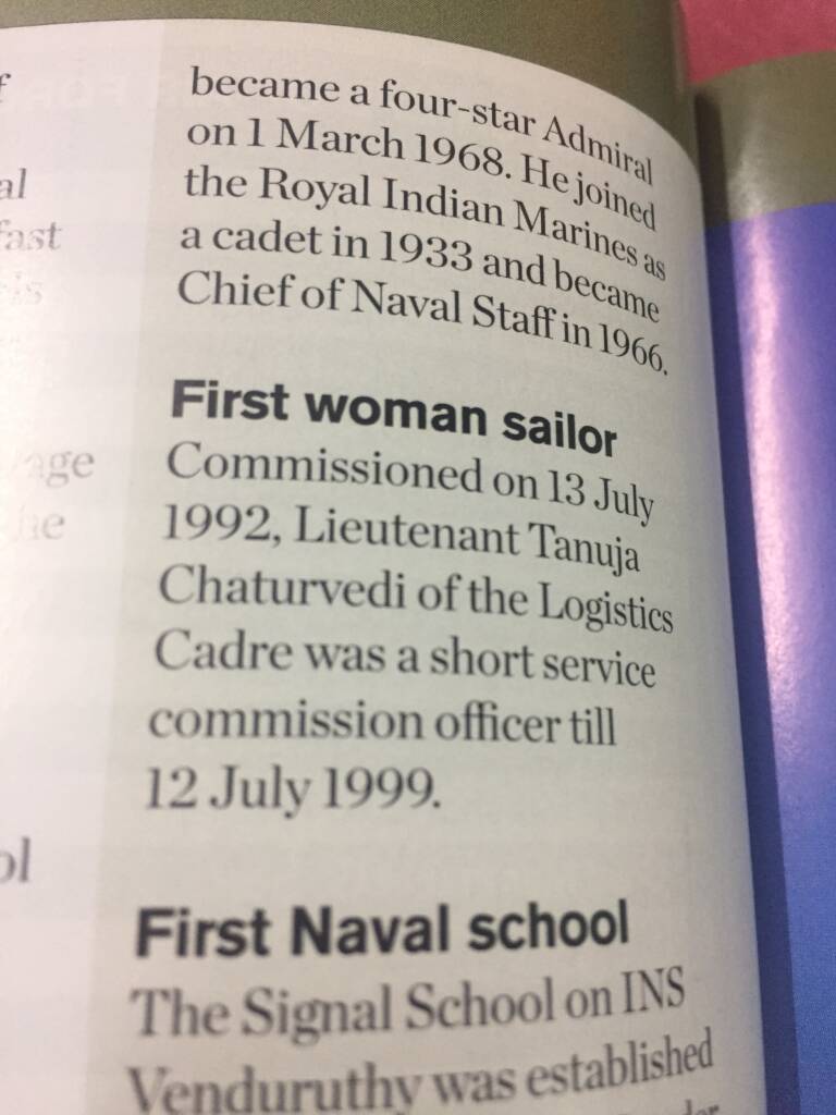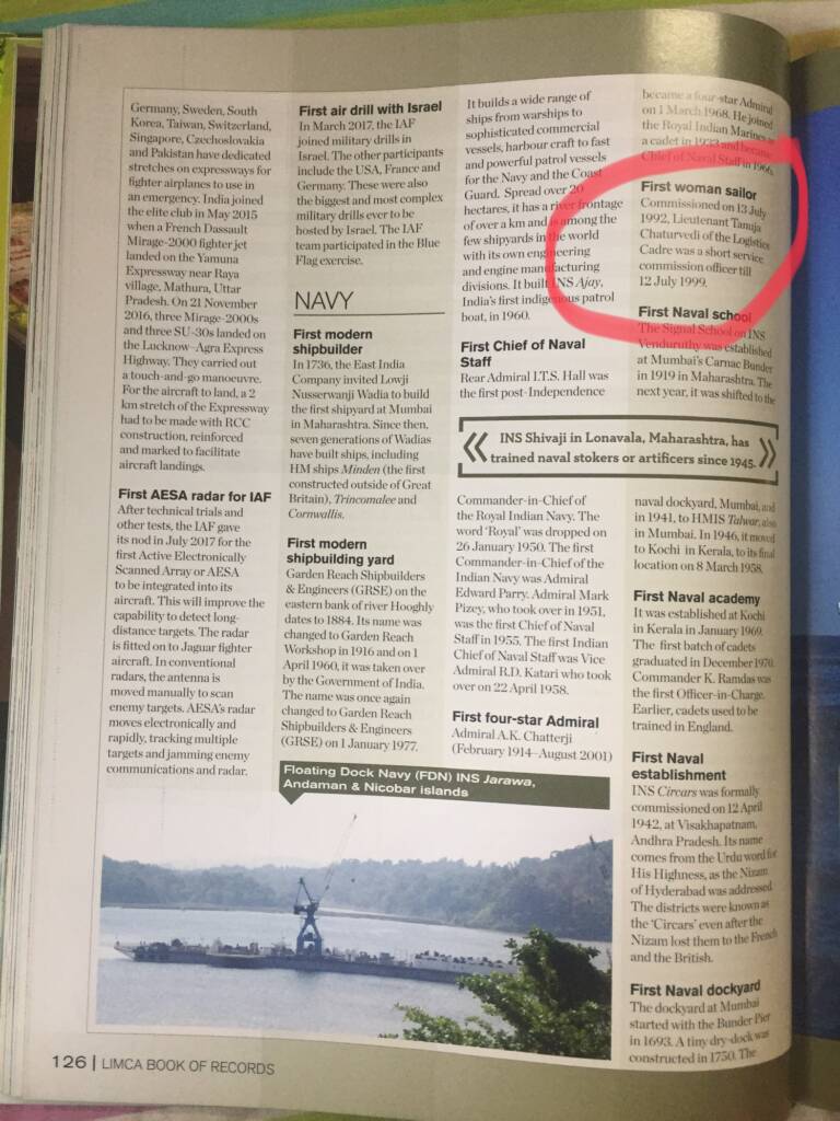 I take immense pride in being featured as the first woman to be commissioned in the Indian Navy in the year 1992 as a Short Service Commission officer in the Limca Book of Records.
